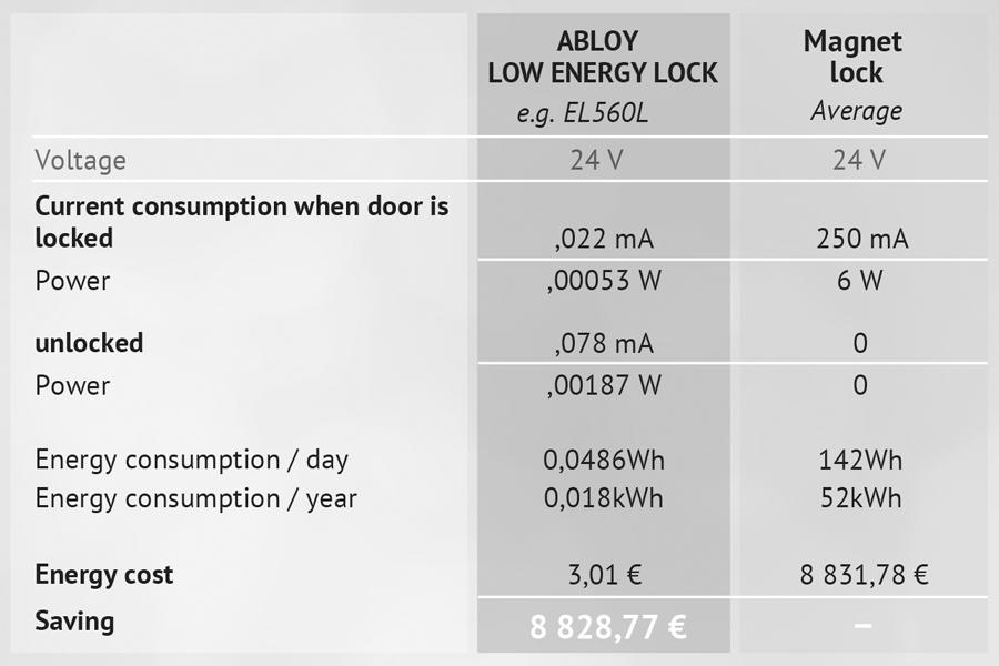 Also, for the user the energy saving means economical savings. When compared for example to magnetic locks, ABLOY LOW ENERGY LOCKS consume only a fraction of energy. This type of products are completely new in locking industry.